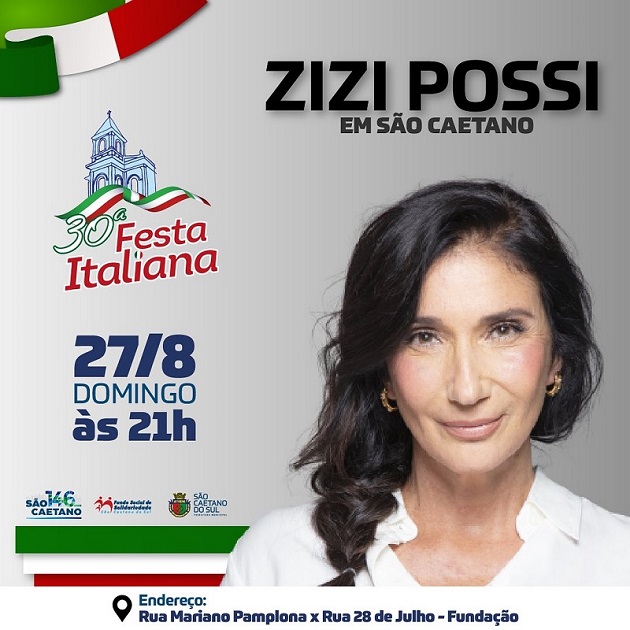 A 30ª Festa Italiana de São Caetano do Sul chega ao último fim de semana. Para encerrar as festividades em grande estilo, a atração principal será a cantora e compositora Zizi Possi. O show acontecerá neste domingo (27), a partir das 21h, no palco do Parque Municipal Província de Treviso, no Bairro Fundação. A entrada é gratuita.