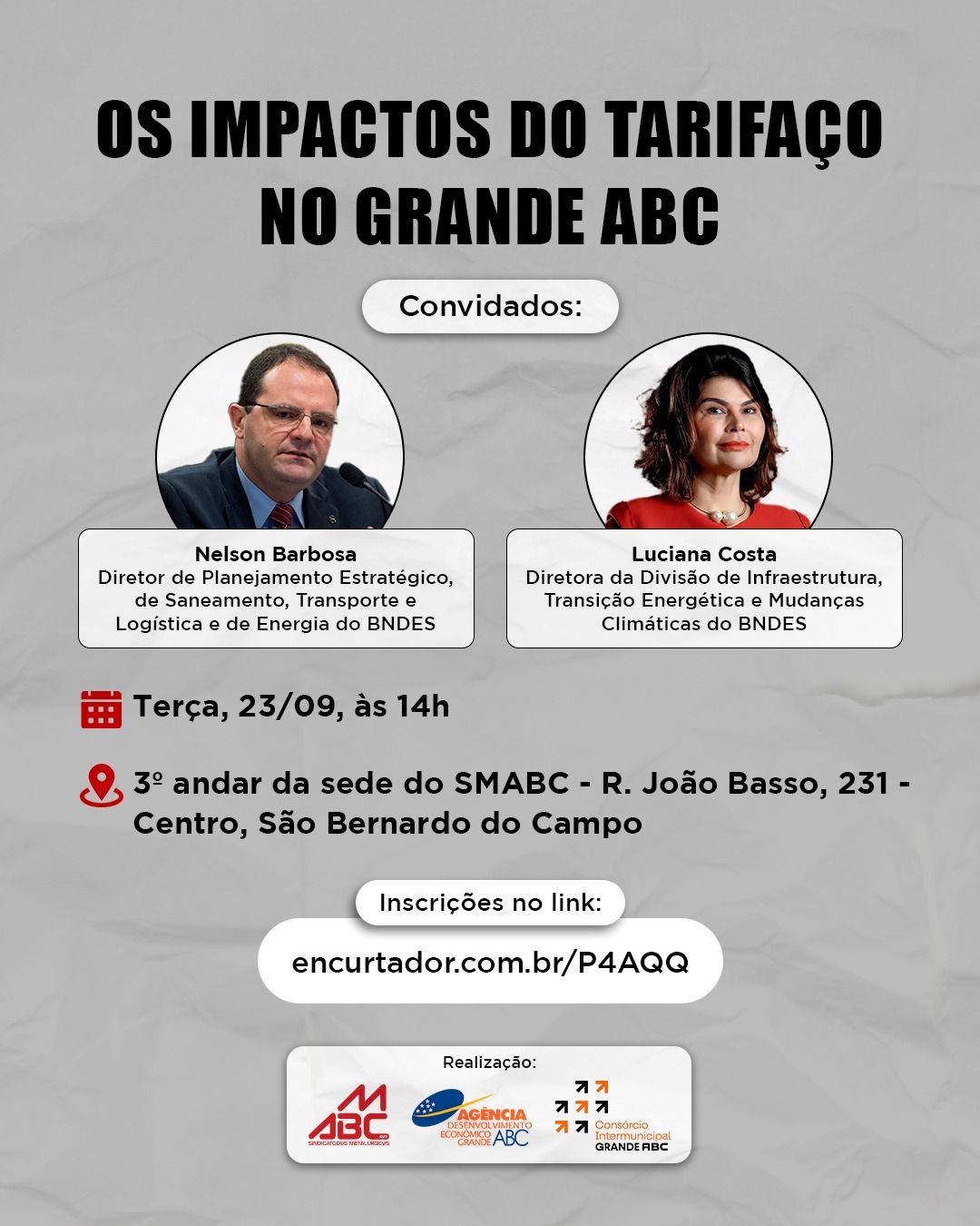 O evento, denominado “Os impactos do Tarifaço no Grande ABC”, será realizado na próxima terça-feira (23), na sede do Sindicato dos Metalúrgicos do ABC (SMABC), contará com a presença dos diretores do BNDES de Planejamento e Relações Institucionais, Nelson Barbosa, de Infraestrutura, Transição Energética e Mudança Climática, Luciana Costa.