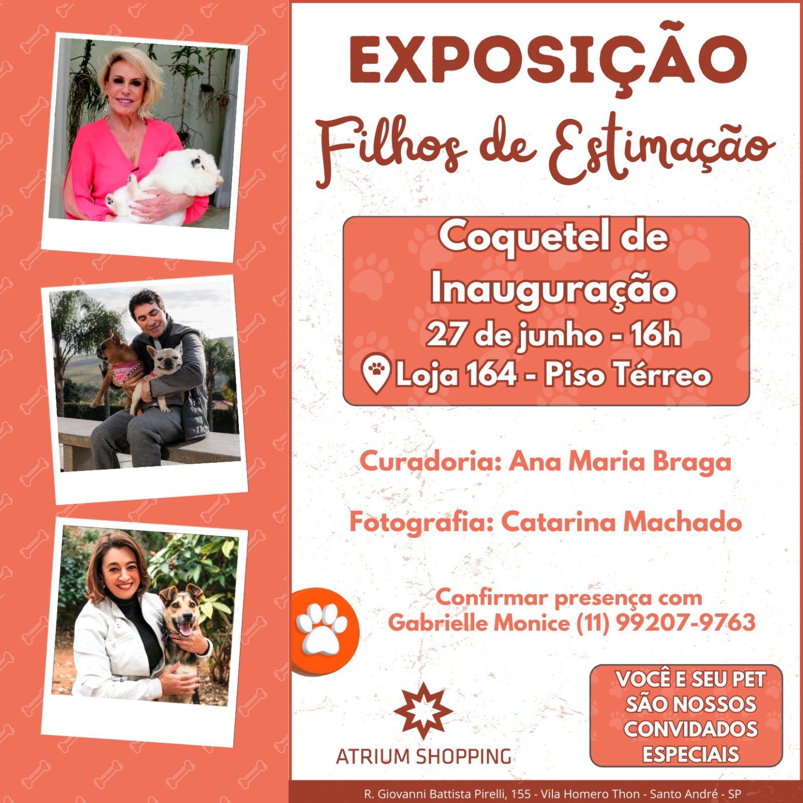 Quem passa pelo Atrium Shopping, em Santo André, pode conferir a exposição inédita Filhos de Estimação repleta de registros de 20 personalidades, entre elas Ana Maria Braga, Ana Paula Padrão, Padre Fábio de Melo, Mauricio de Sousa e muitos outros.