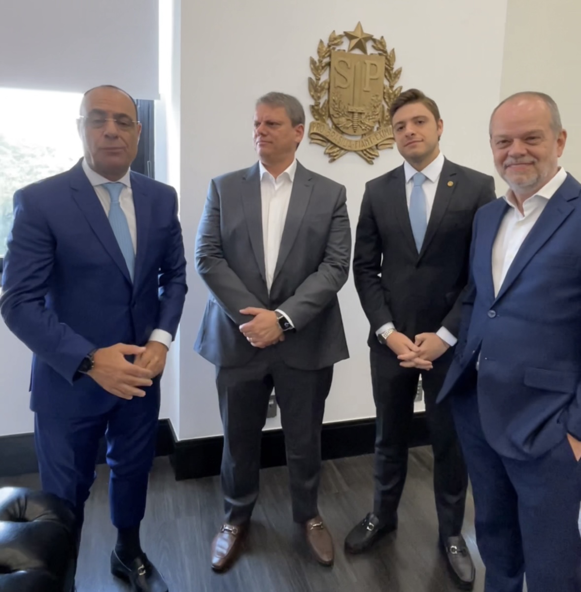O governador de São Paulo, Tarcísio de Freitas, recebeu nesta terça (11) o prefeito de São Caetano, José Auricchio Júnior (PSD), o deputado estadual Thiago Auricchio (PL) e o pré-candidato a prefeito Tite Campanella (PL).
