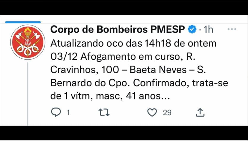O Corpo de Bombeiros encontrou o corpo de um homem, ainda não identificado, que foi arrastado pela enxurrada durante a chuva da tarde deste sábado (03) em São Bernardo. Ele teria sido levado pelas águas do córrego Taioca, no bairro Baeta Neves quando passava pela rua Cravinhos, na região da Chácara Baronesa. O homem estava passando próximo a uma das pontes que atravessam o córrego quando foi arrastado. Segundo os bombeiros, a vítima sofreu afogamento, tinha 41 anos e foi encontrada próxima à Estação de Tratamento da Sabesp, na região da Avenida Almirante Delamare, no bairro de Heliópolis, na capital.
