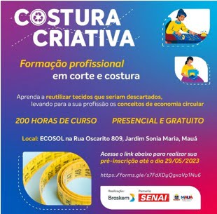 A aula inaugural da primeira turma do Costura Criativa acontecerá em 02 de junho, com formatura e conclusão do curso prevista para agosto deste ano.