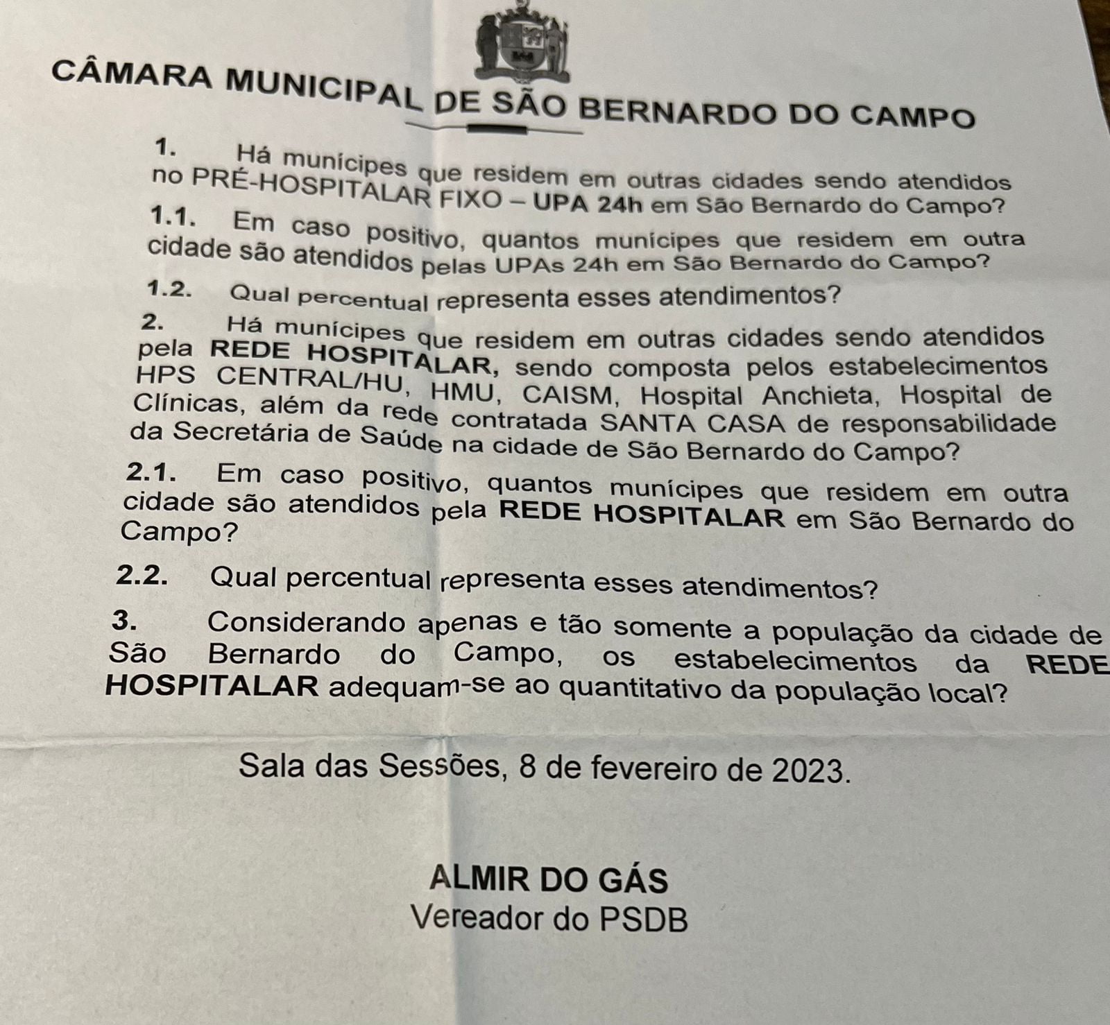 Requerimento é de autoria do vereador Almir do Gás (PSDB). Em entrevista, ele citou os atendimentos feitos a moradores de Diadema que, segundo ele, possam de 30%.