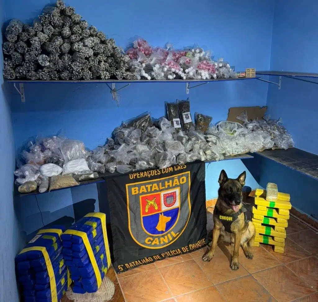 Um cão farejador do Canil da Polícia Militar ajudou os policiais a encontrar um cofre que armazenava diversas porções de drogas. O compartimento foi instalado em uma casa do bairro Rio Pequeno, na zona oeste de São Paulo.