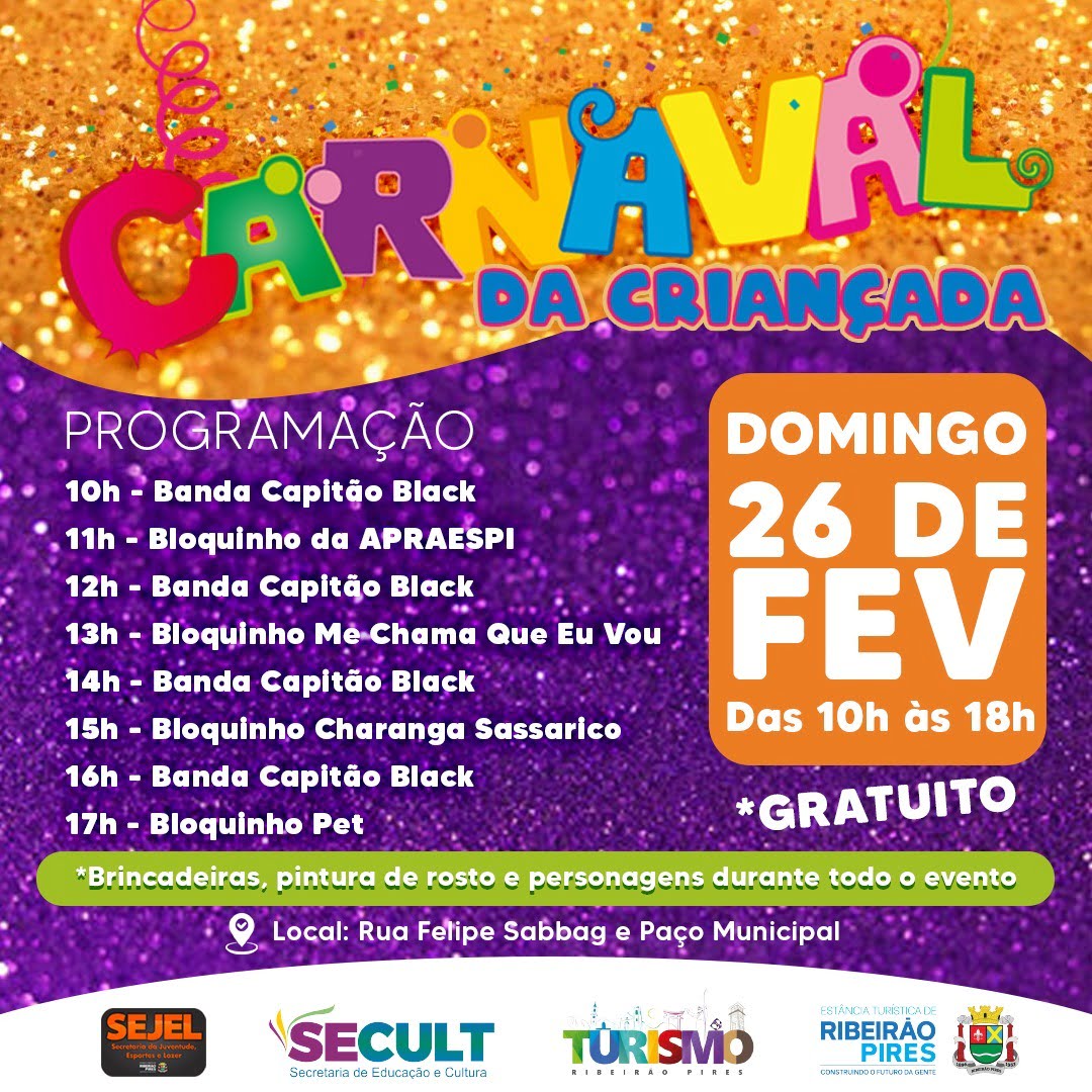 O carnaval se despede em grande estilo com a festa da criançada de Ribeirão Pires. O evento será realizado no próximo domingo (26), das 10h às 18h, no circuito que engloba o Paço Municipal e a rua Felipe Sabbag.