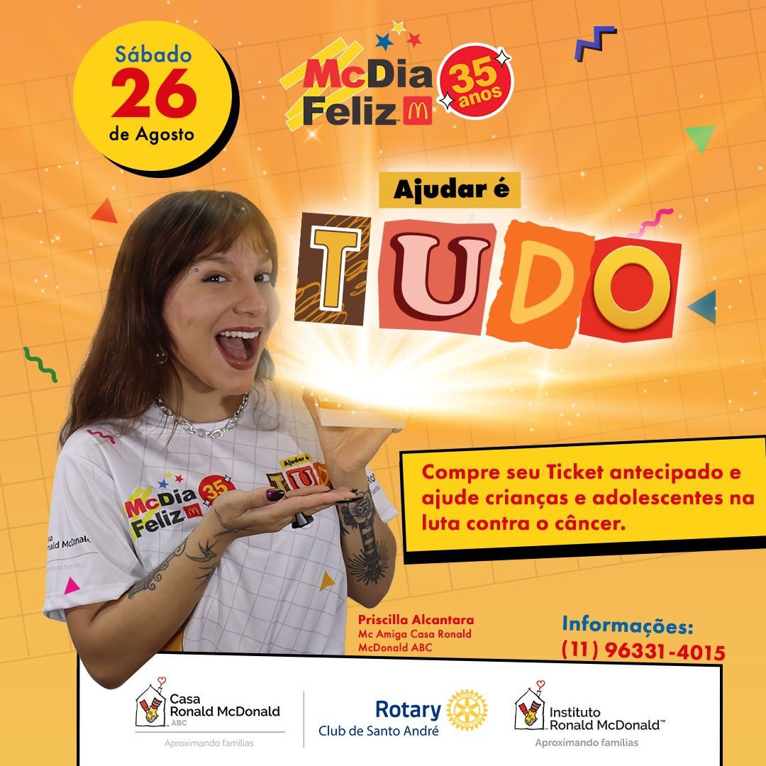 A Casa Ronald McDonald ABC, que há 16 anos oferece apoio integral às crianças e aos adolescentes em tratamento oncológico e suas famílias, é ponto de venda do tíquete antecipado para o McDia Feliz no valor de R$18, que vale um Big Mac neste sábado (26). Outros produtos estão disponíveis para compra como: boné, caneca, moleskine e camisetas.