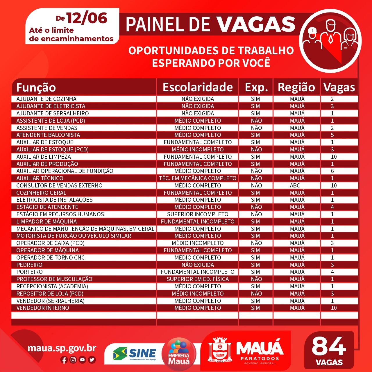 O painel da unidade conta com 84 vagas para empresas de Mauá e outras cidades do ABC. O sistema é atualizado a cada semana.