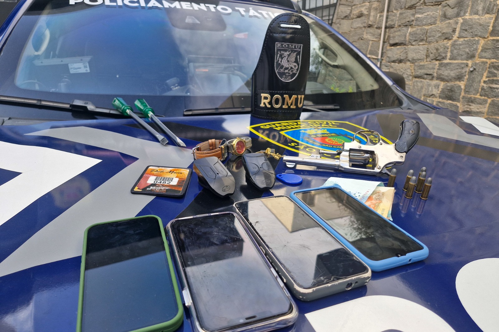 Durante a abordagem aos cinco integrantes dos veículos foram encontrados um revólver calibre 32, além de chaves de fenda, controles remotos, relógios de pulso e outros objetos. Todos os envolvidos e os pertences encontrados foram enviados à Delegacia Sede.