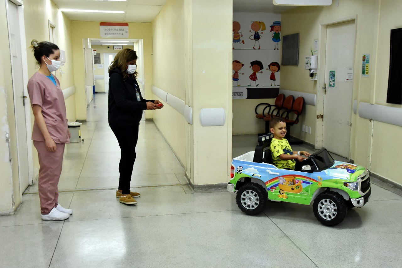 O Centro Hospitalar Municipal (CHM), em Santo André, segue inovando e promovendo mais acolhimento aos pacientes internados no local. O momento tão esperado da alta médica dos pacientes da pediatria se tornou ainda mais especial e emocionante. Isso porque, agora, as crianças saem do quarto dirigindo um carrinho elétrico. A iniciativa integra as ações de humanização do local que contam com a recente entrega da Brinquedoteca e com o retorno dos trabalhos voluntários. “Juntamente com a entrega da Brinquedoteca revitalizada, o ‘carrinho de alta’ faz parte da cultura de humanização que estamos aperfeiçoando a cada dia dentro do CHM. Ver a alegria das crianças com os brinquedos e agora a no momento da alta é gratificante e um reforço no processo de cuidado com a saúde”, pontua o superintendente da Atenção Hospitalar, Victor Chiavegato. O pequeno Dérek Santos, de 3 anos, estava internado no CHM desde o último sábado (9) após cair de uma altura de seis metros. Após se recuperar, a expectativa estava grande para passar pelo corredor no carrinho nesta semana, rumo à alta médica. “Domingo o Dérek caiu da janela e o Samu trouxe ele para cá. Ele ficou três dias na UTI, depois teve alta para o quarto e agora está indo para casa. É um momento de muita emoção. Eu quase o perdi, mas Deus me deu ele novamente. Antes da alta ele se distraiu na Brinquedoteca e agora está ansioso para sair no carrinho, que é um sonho. Esse é um programa fundamental, ele está aqui há oito dias e eles precisam desse acolhimento. A internação já é muito difícil e eles precisam desse cuidado humanizado para passar por essa fase difícil”, diz a técnica de enfermagem Jenifer Santos, emocionada com a alta do filho. As crianças internadas na enfermaria também podem usufruir da recém-entregue Brinquedoteca. O espaço é muito importante, pois além de promover distração enquanto as crianças brincam, as equipes passam informações e orientações aos acompanhantes, promovendo interação entre pacientes, familiares e profissionais. “A alta é um momento muito esperado para as crianças. Agora, além da expectativa da alta, tem o carrinho em que elas podem dar essa volta, então o momento se tornou ainda mais importante. É uma grande conquista para as crianças”, diz a coordenadora de Enfermagem da Pediatria e UTI Pediátrica, Luciene Postigo.