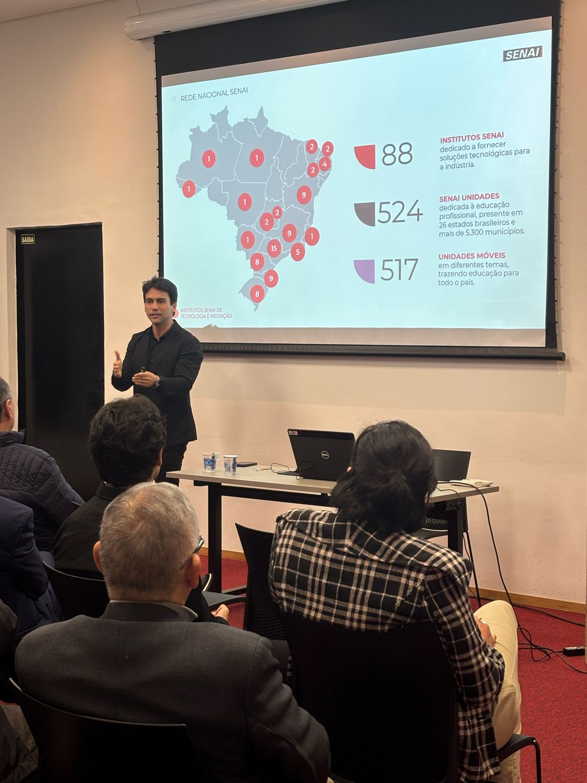 O encontro teve como destaque a apresentação do Distrito Tecnológico do SENAI-SP, conduzida por Fabrício Luz Lopes, gerente da unidade e referência nacional em Indústria 4.0, inteligência artificial e ESG.