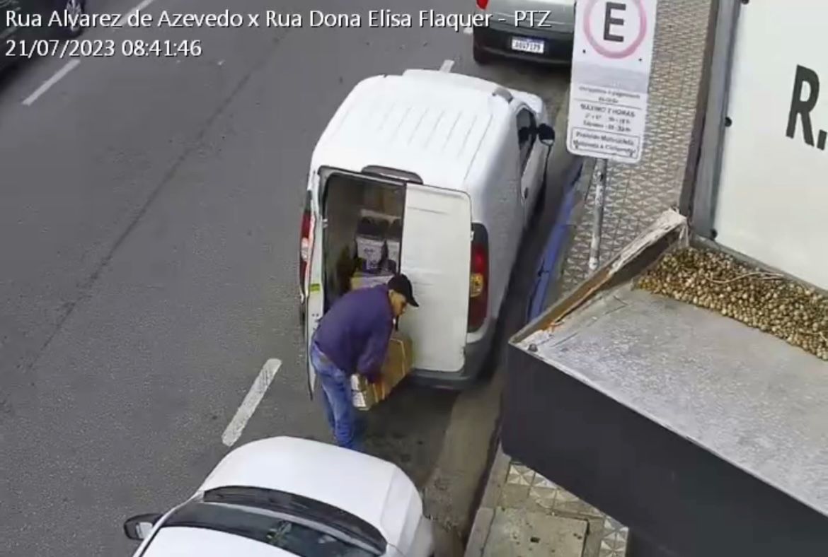 Por meio do monitoramento, as câmeras do COI acompanharam a movimentação de dois indivíduos em um Palio, que estacionou em frente a um veículo utilitário Fiorino cheio de mercadorias que seriam descarregadas no comércio da região.