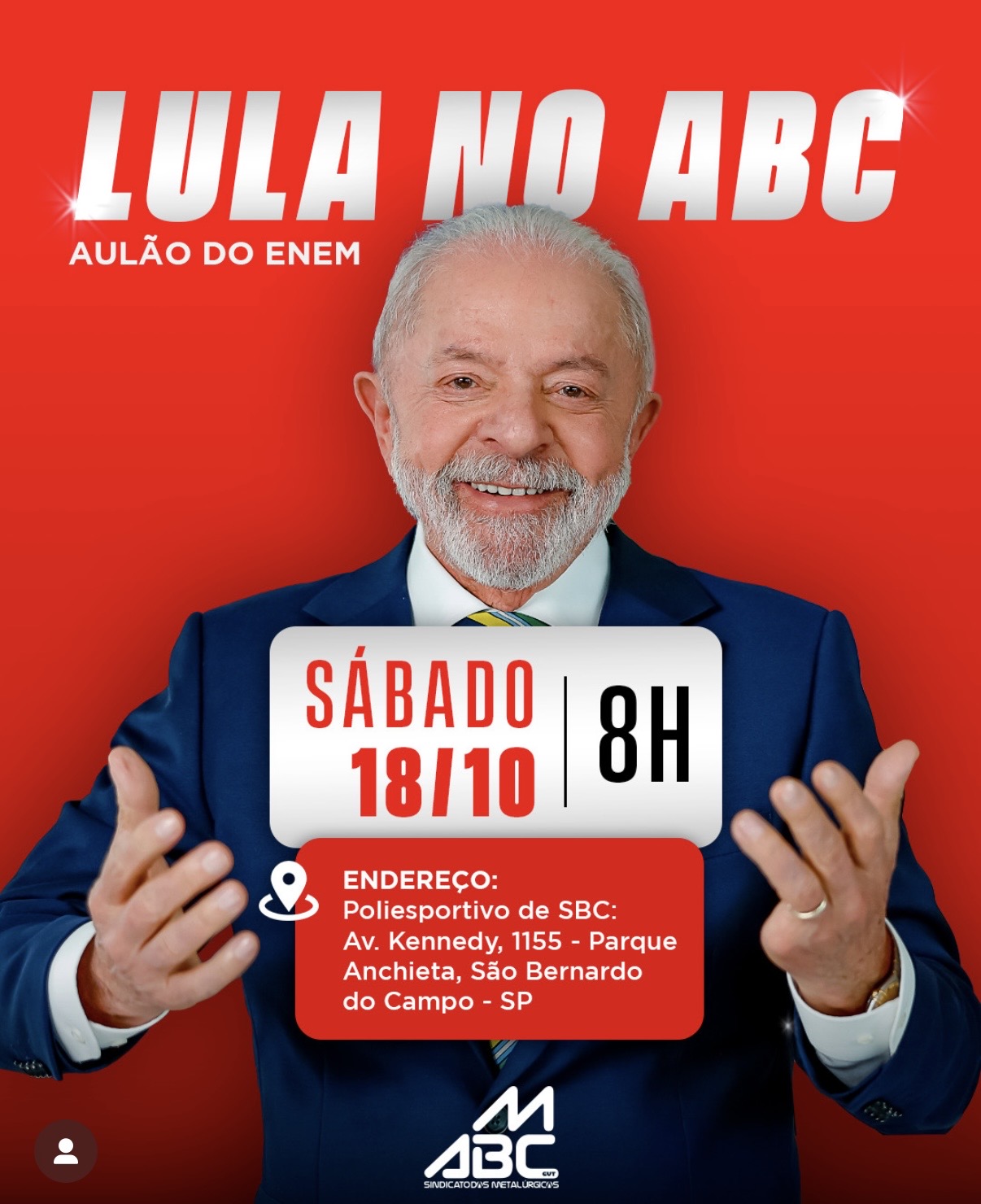 Está confirmada a presença do presidente Luiz Inácio Lula da Silva em São Bernardo neste sábado (18), para participar de um Aulão do Enem no Ginásio Poliesportivo de São Bernardo, localizado na Avenida Kennedy, 1155 – Parque Anchieta.