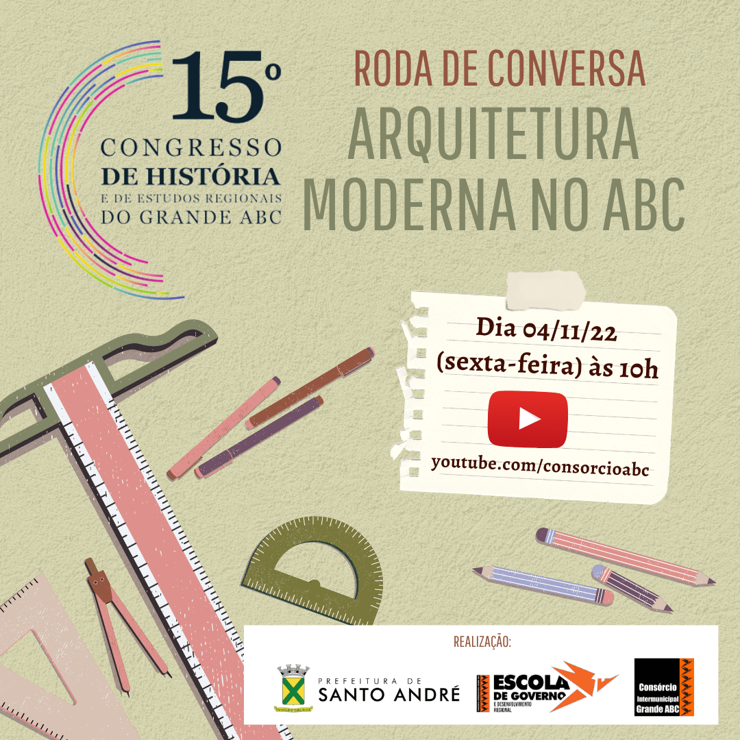 A programação da 15ª edição do Congresso de História e de Estudos Regionais do Grande ABC terá um evento preparatório na próxima semana. A roda de conversa online “Arquitetura Moderna no ABC” será transmitida ao vivo em 4 de novembro (sexta-feira), às 10h, no canal do Consórcio ABC no Youtube (www.youtube.com/consorcioabc).