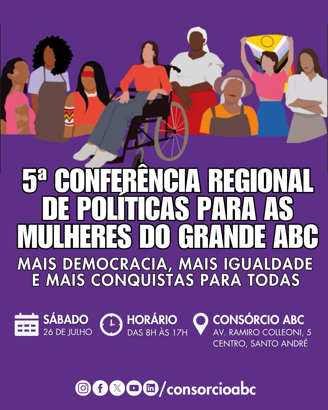 O Consórcio Intermunicipal Grande ABC promove em 26 de julho (sábado) a 5ª Conferência Regional de Políticas para as Mulheres.