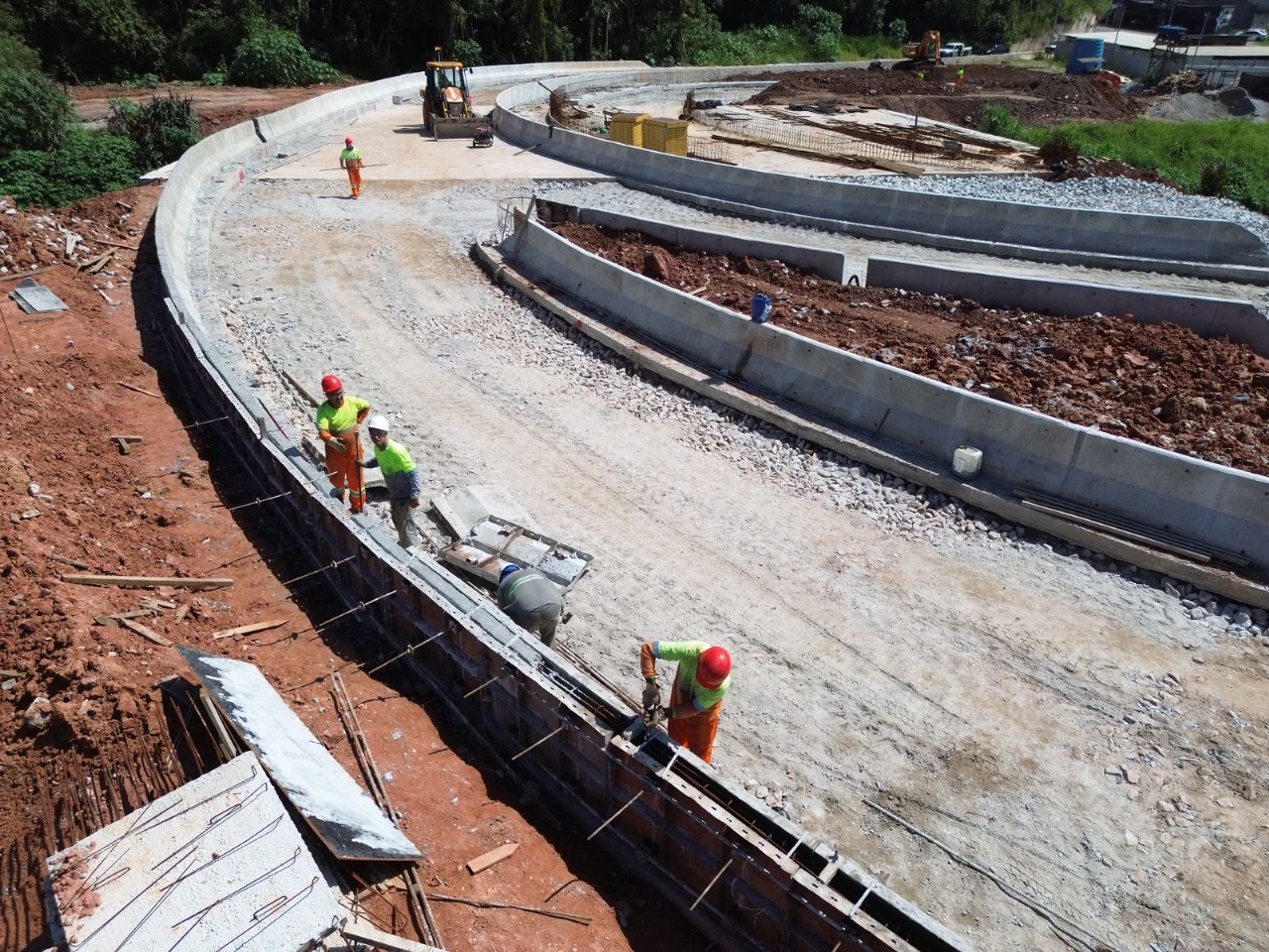 As obras do Viaduto Estaiado de Ribeirão Pires seguem em ritmo acelerado. Equipes trabalham na etapa final de implantação das alças de acesso do novo equipamento viário, que ligará Centro e Centro Alto. A próxima fase do projeto prevê o início da construção das vigas e fundação da ponte estaiada.