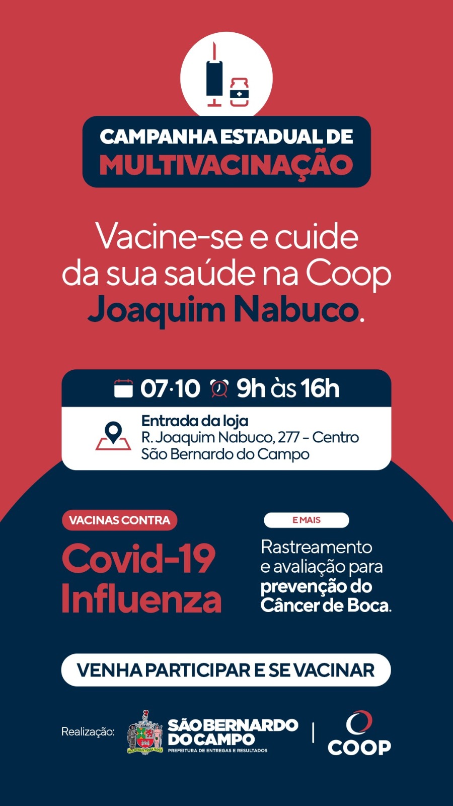 Com a proposta de aumentar a cobertura vacinal de crianças e adolescentes de até 15 anos de idade, o Governo de São Paulo realizará no sábado (7), a Campanha Estadual de Multivacinação e a loja da Coop, localizada na Rua Joaquim Nabuco, 277, em São Bernardo, será um posto avançado de imunização.