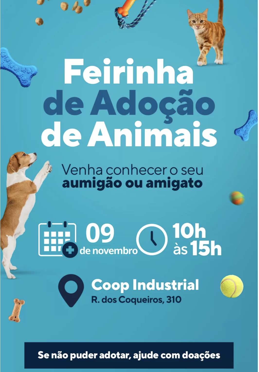 Dessa forma, a unidade Industrial da Coop, localizada na Rua dos Coqueiros, 310, Campestre – Santo André, sediará em seu estacionamento mais uma edição da feira de adoção animal. O evento acontecerá no sábado (9 de novembro), no horário das 10h às 15h e, para se tornar um tutor, é preciso apresentar um documento pessoal original, comprovante de endereço recente e passar por uma entrevista.