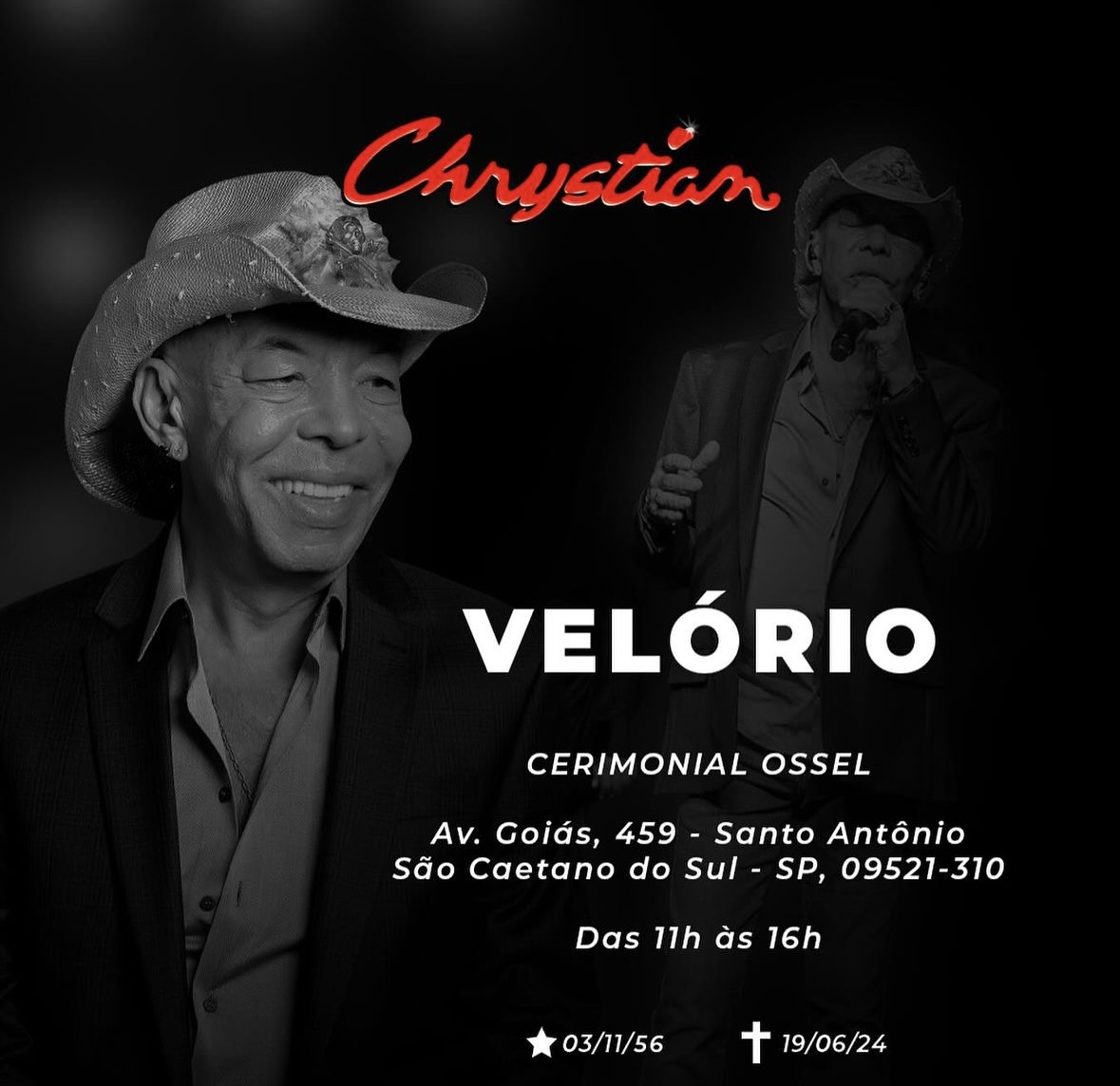 “Com imenso pesar, a família e a equipe de Chrystian, comunicam o falecimento do nosso querido esposo, pai e artista, ocorrido no Hospital Samaritano, em São Paulo.
