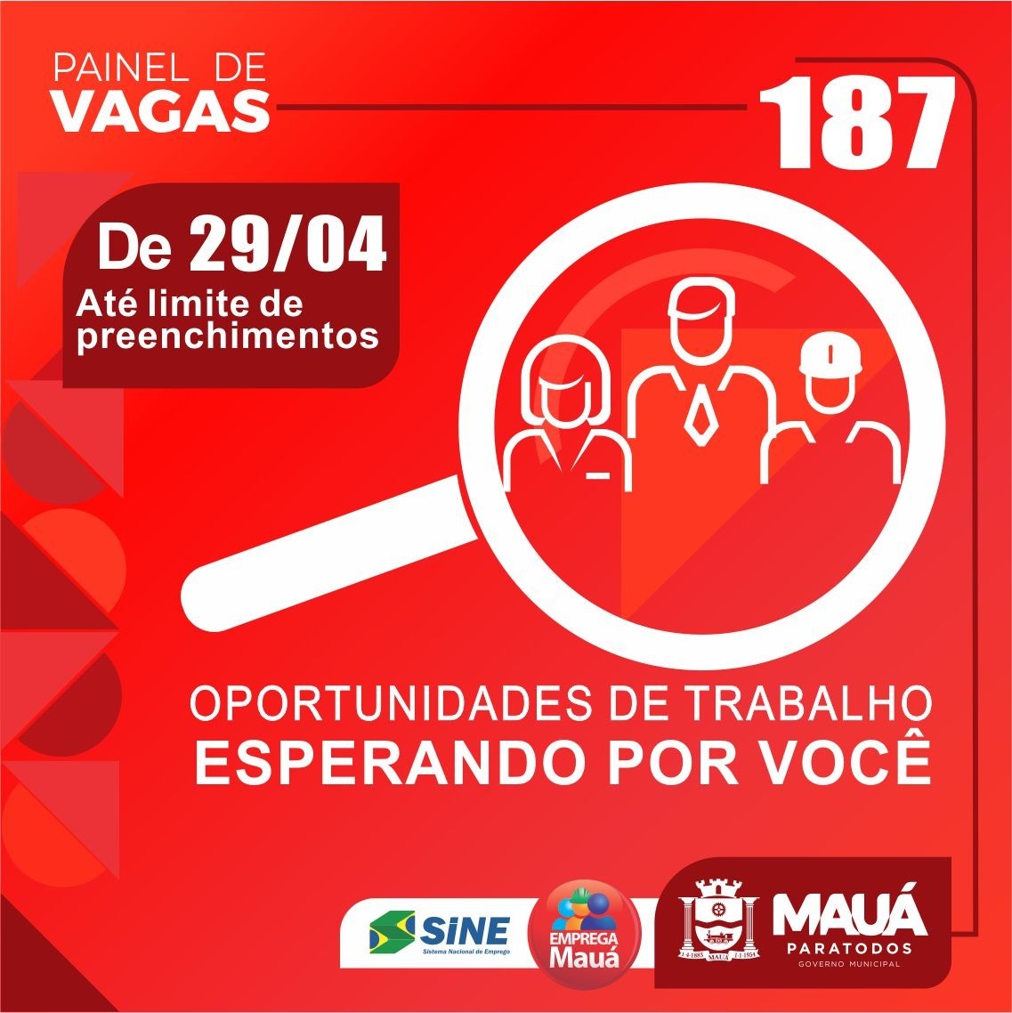 O Centro Público de Trabalho e Renda (CPTR) de Mauá, mantido pela Prefeitura, abre a semana com 187 oportunidades profissionais, para empresas da cidade e da região do ABC. O painel integra o programa Emprega Mauá, que busca inserir profissionais no mercado de trabalho, e é atualizado diariamente.