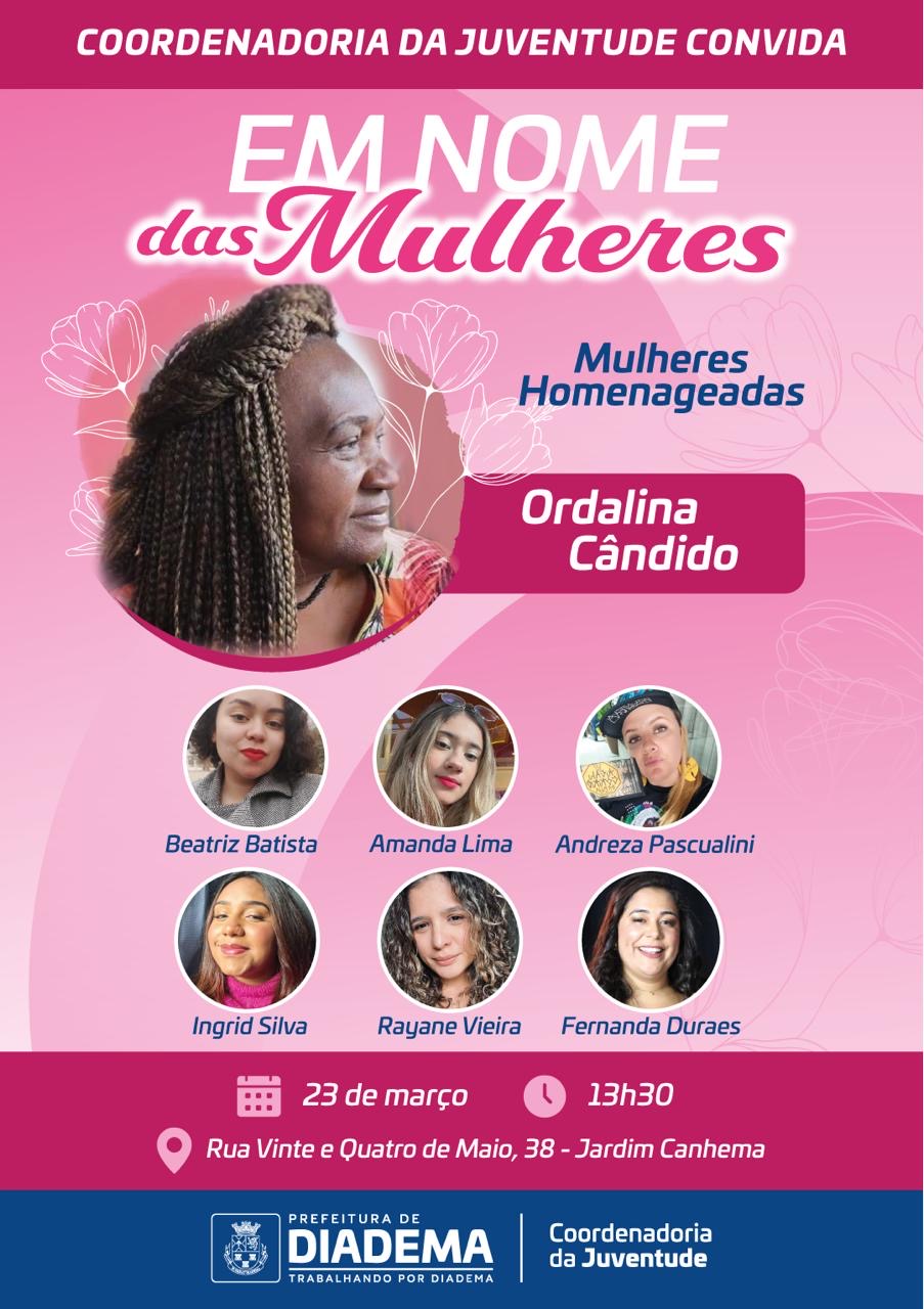 A Coordenadoria da Juventude de Diadema irá realizar, no domingo, 23 de março, a partir das 13h30, o encontro “Em Nome das Mulheres”, na Casa do Hip-Hop do município.