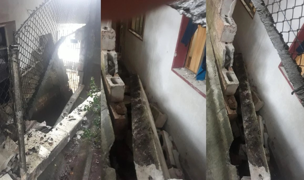 Parte do muro da Emeb Santo Dias, localizada na rua 26 de abril, Jardim Canhema, em Diadema, caiu durante as fortes chuvas ocorridas na cidade nesta sexta-feira (4).