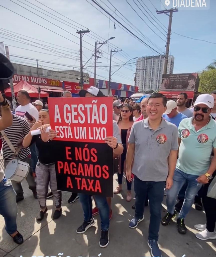 Cerca de 200 moradores e lideranças da cidade, juntamente com Taka Yamauchi, os vereadores Boy, Eduardo Minas, Reinaldo Meira, Cabo Ângelo, a ex-vereadora Cida Ferreira e os ex-vereadores Juninho do Chicao, Marcos Michels e. Sérgio Mano, circularam neste sábado (2) pelas ruas do centro de Diadema para protestar contra a taxa do lixo aplicada na cidade e aprovada por 15 vereadores. A taxa é cobrada junto com a conta de água e está em vigência desde o mês de abril.