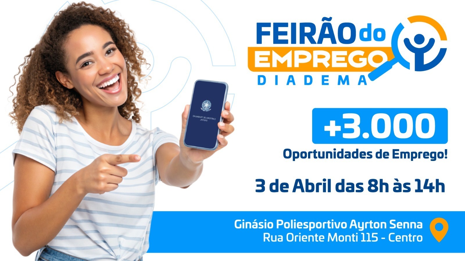 O Feirão do Emprega Diadema acontece das 8h às 14h, no Ginásio Poliesportivo Ayrton Senna (Rua Oriente Mori, 115 – Centro, Diadema). Para participar, basta comparecer levando cópias do currículo.