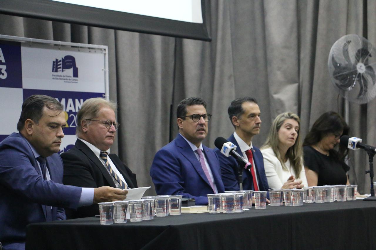 A cerimônia de abertura foi marcada pela presença de ilustres convidados compondo a mesa de debates, incluindo o Prof. Dr. Rodrigo Gago Freitas Vale Barbosa, diretor da Direito São Bernardo; Prof. Dr. Arthur Rollo, titular da Faculdade e Coordenador da SemanaJur; Prof. Dra. Ana Paula da Fonseca, Coordenadora de Graduação; Dr. Luiz Ricardo Bertanha, presidente da OAB (Ordem dos Advogados do Brasil) 39ª subseção São Bernardo; e o palestrante da manhã, Prof. Dr. Luca Mezzetti, renomado professor italiano.