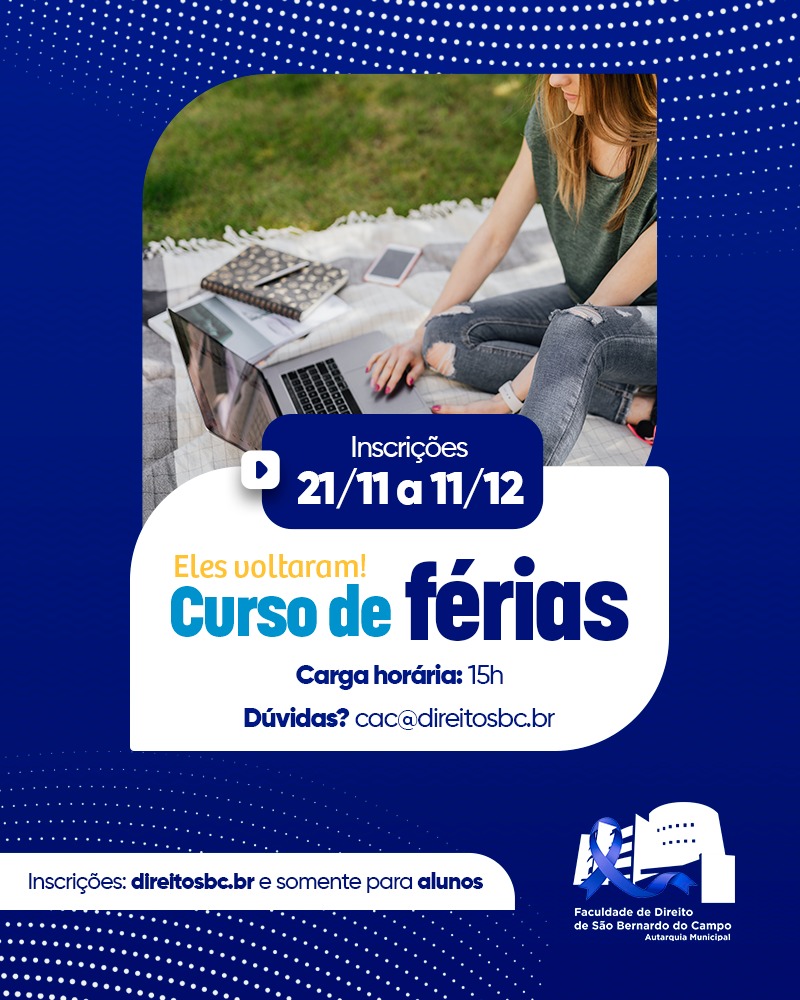 A Faculdade de Direito São Bernardo do Campo (FDSBC) está com inscrições abertas para seus cursos de férias. Com o objetivo de proporcionar uma oportunidade de capacitação extra durante o período de recesso dos alunos, a instituição oferece uma variedade de cursos ministrados por professores da Autarquia e também professores externos selecionados através de chamamento público.