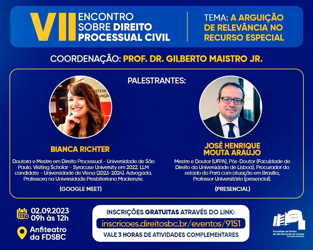 O encontro é uma realização do Departamento de Direito Processual Civil da FDSBC, organizado pelo Prof. Dr. Gilberto Carlos Maistro Junior. Com a data marcada para o dia 02 de setembro, das 09h às 12h, acontece no Anfiteatro da Autarquia, na Rua Java, 425, Jardim do Mar.