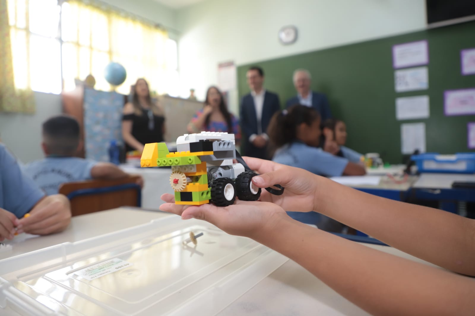 As aulas de robótica atendem 64 Emeiefs (Escolas Municipais de Educação Infantil e Ensino Fundamental) com capacitação técnica e pedagógica presencial para 386 docentes e 36 monitores de inclusão digital.