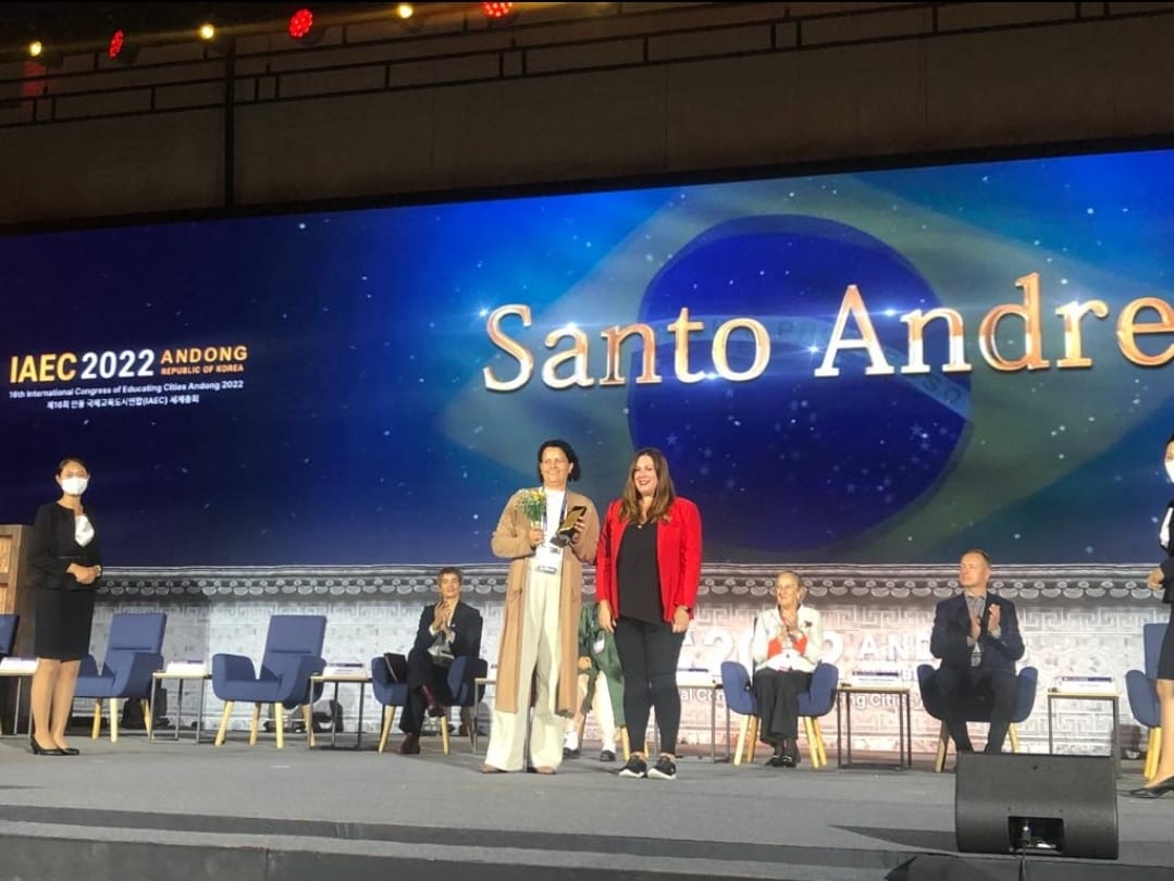 O projeto andreense recebeu um diploma por ter ficado entre os dez programas selecionados no Prêmio Cidades Educadoras, entregue durante o evento. “Participar desse prêmio reafirma que a Educação andreense está no caminho certo, considerando que as experiências, projetos e práticas exitosas apresentadas por diversas cidades de todos os continentes já são realizadas nas unidades escolares do município”, afirma a secretária adjunta de Educação de Santo André, Érica Ferreira, que representou a equipe e recebeu o diploma na cidade sul-coreana.