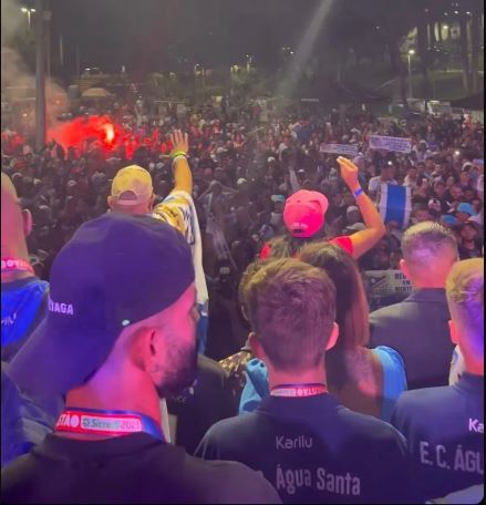 Os jogadores e a comissão técnica chegaram à Praça da Moça por volta de 21h30 e foram ovacionados, ao som dos cantos de “guerreiro, guerreiro, time de guerreiro”.