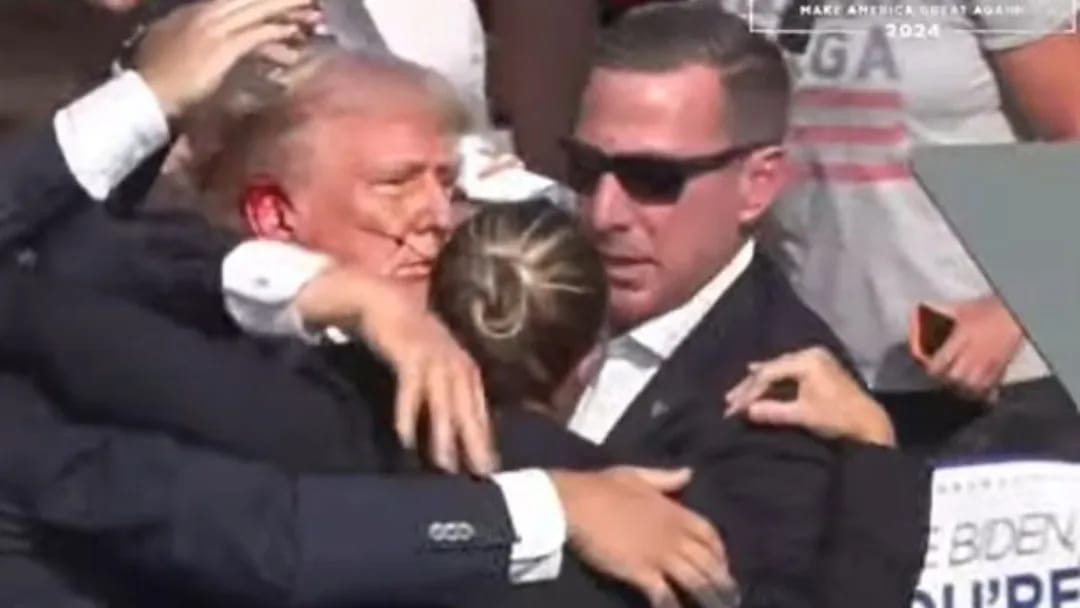 A imagem mostra o que parece ser sangue na orelha de Trump. O Serviço Secreto dos EUA informa que ele está seguro e que medidas de proteção foram implementadas ao seu redor.