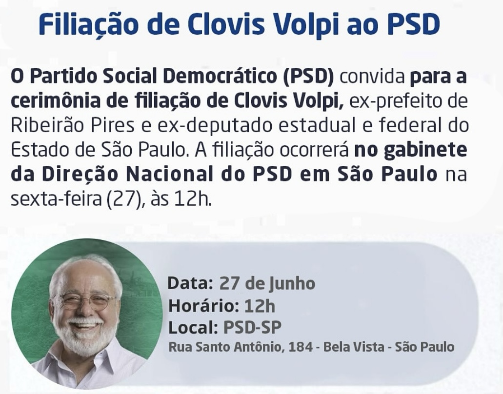 O ex-prefeito de Ribeirão Pires, Clovis Volpi, vai se filiar ao PSD, de Gilberto Kassab, nesta sexta (27).
