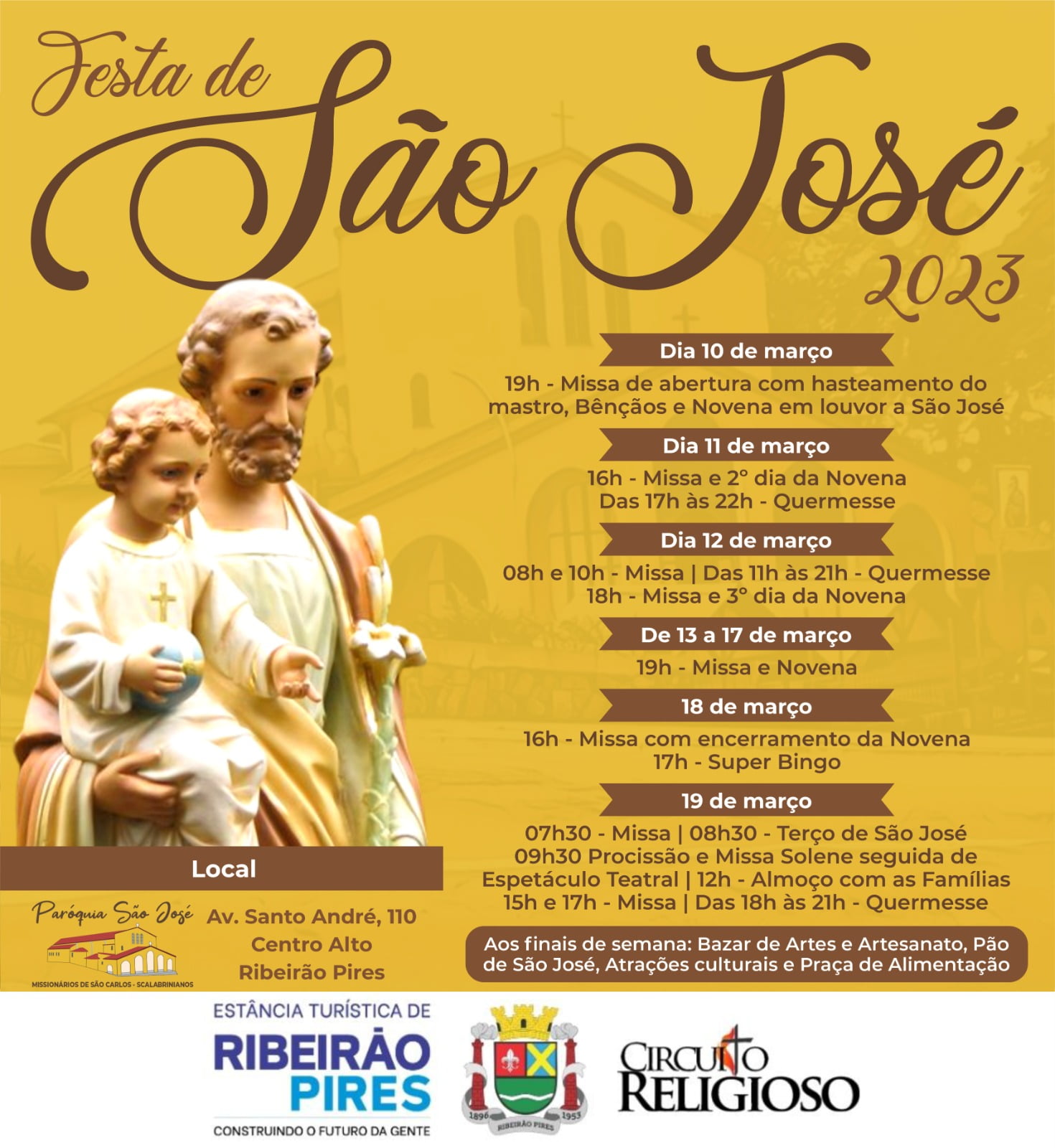 Com o apoio da prefeitura de Ribeirão Pires, começou na sexta-feira (10), e segue até o dia 19, a Festa de São José 2023. O evento, que homenageia o santo padroeiro da Estância, é organizado pela Paróquia Matriz e faz parte do Circuito Religioso, programa da Secretaria de Turismo que fomenta o turismo da fé.