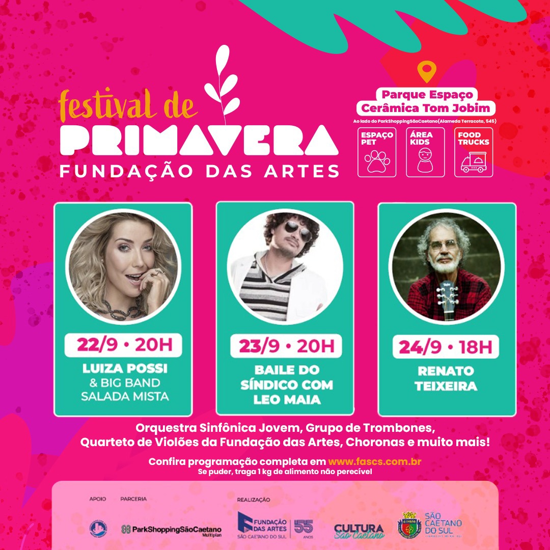 Nesta sexta, sábado e domingo (22, 23 e 24 ), o Parque Espaço Cerâmica Tom Jobim, ao lado do ParkShopping São Caetano, receberá o Festival de Primavera Fundação das Artes.