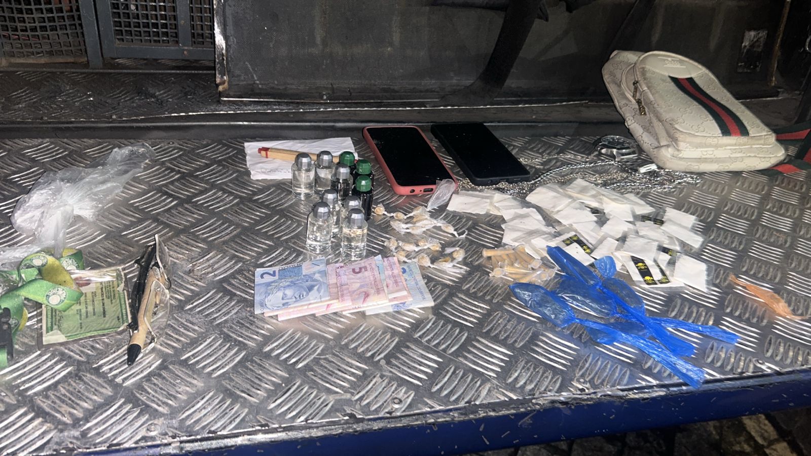 Após o impacto, os ocupantes do veículo tentaram fugir, mas foram rapidamente contidos pelas equipes da ROMU. Durante a busca veicular, os agentes localizaram diversas porções de entorpecentes, incluindo cocaína, crack, maconha e lança-perfume, além de uma quantia em dinheiro, evidenciando a prática de atividades criminosas.