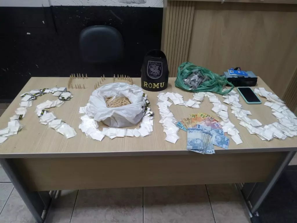 Segundo relato da equipe, o condutor do veículo demonstrou atitude suspeita e desobedeceu a ordem de parada dos agentes. Durante a revista, foram encontrados R$ 937 em espécie e uma sacola com 946 porções de drogas.