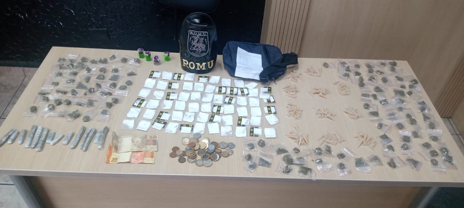 Neste domingo (29) durante patrulhamento de rotina, a equipe da ROMU (Ronda Ostensiva Municipal), prendeu um homem que transportava mais de 300 porções de drogas no Parque Aliança. Foram apreendidos 110 pinos de cocaína, 65 pinos de crack e 133 porções de maconha.