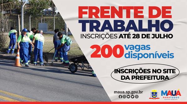 O prazo das inscrições para a Frente de Trabalho da Prefeitura de Mauá termina nesta sexta-feira (28). Estão disponíveis 200 vagas que serão destinadas a munícipes em situação de vulnerabilidade social.