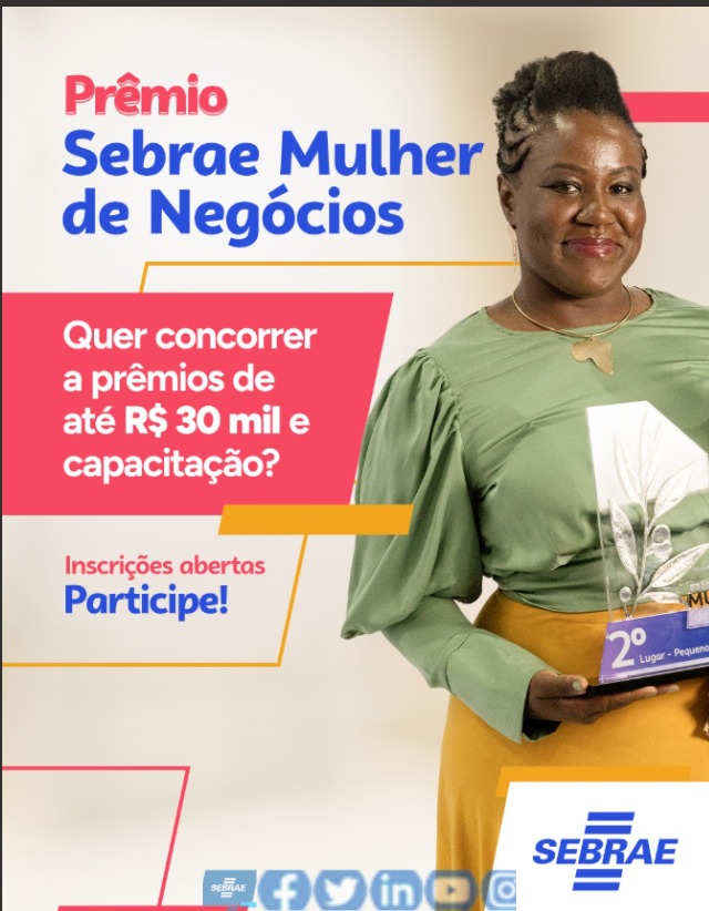 O Prêmio Sebrae Mulher de Negócios 2025 está com inscrições abertas até o dia 15 de junho. A iniciativa celebra o protagonismo feminino no empreendedorismo e reconhece histórias inspiradoras de mulheres que, com seus negócios, transformam vidas e contribuem para o desenvolvimento do país. Para se inscrever, basta acessar o site oficial do prêmio.