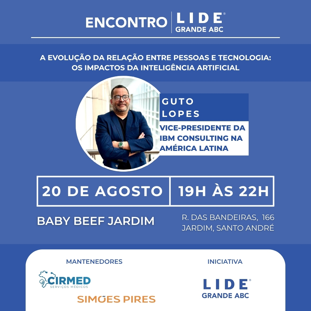 O LIDE ABC realiza na próxima quarta-feira (20), das 19h às 22h, o encontro “A Evolução da Relação entre Pessoas e Tecnologia: Os Impactos da Inteligência Artificial”, que será conduzido por Guto Lopes, vice-presidente da IBM Consulting na América Latina.