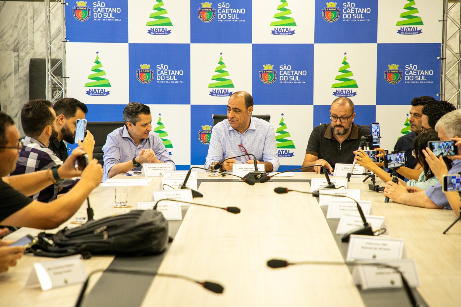 Os secretários municipais de Governo, Jefferson Cirne da Costa, de Cultura, Erike Busoni, e de Serviços Urbanos, Luis Galarraga, também participaram da coletiva.