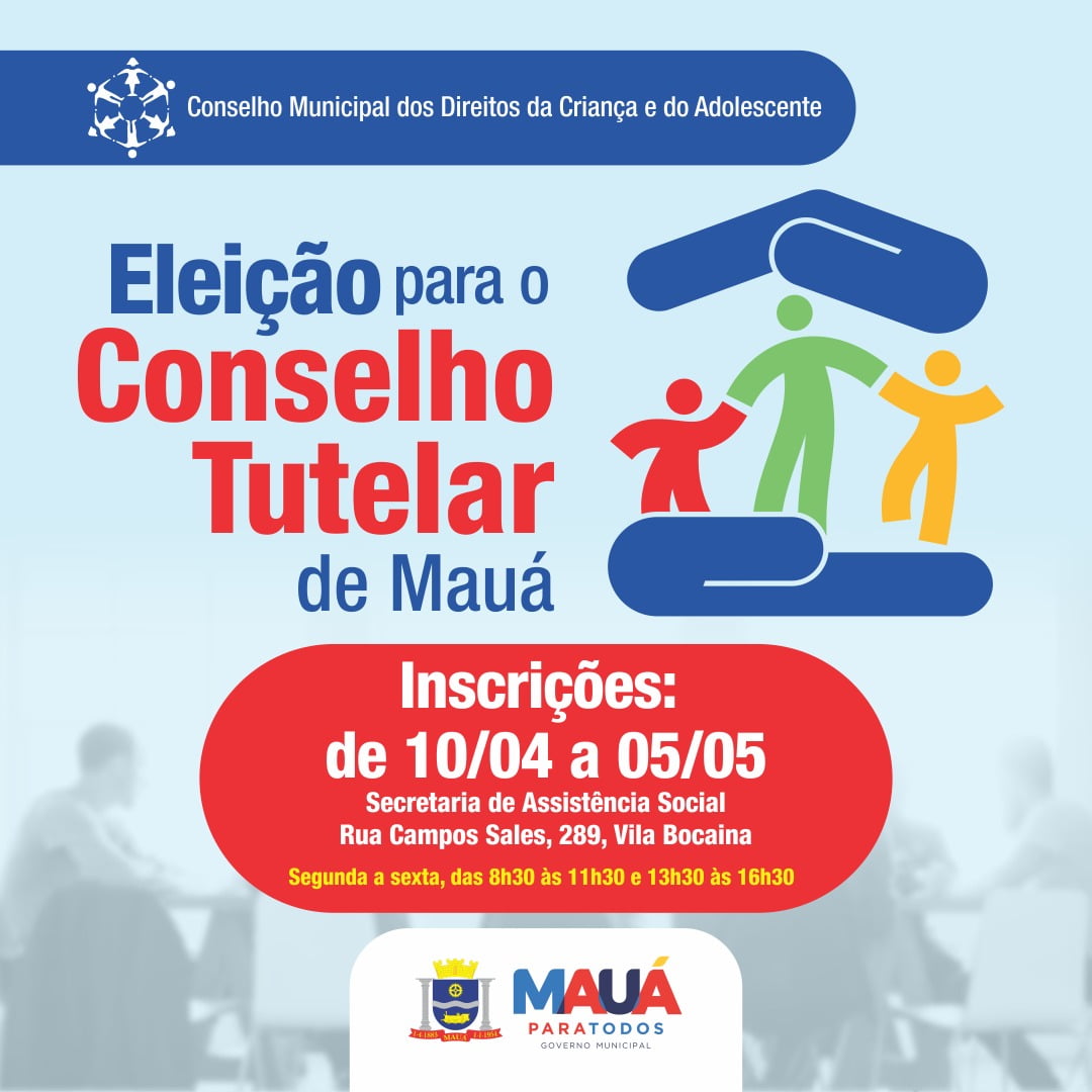 Estão abertas as inscrições para a eleição dos novos conselheiros tutelares de Mauá. Os interessados devem se dirigir pessoalmente à sede da Secretaria de Assistência Social, de segunda a sexta-feira, das 8h30 às 11h30 e das 13h30 às 16h30. O endereço é rua Campos Sales, 289, Vila Bocaina.