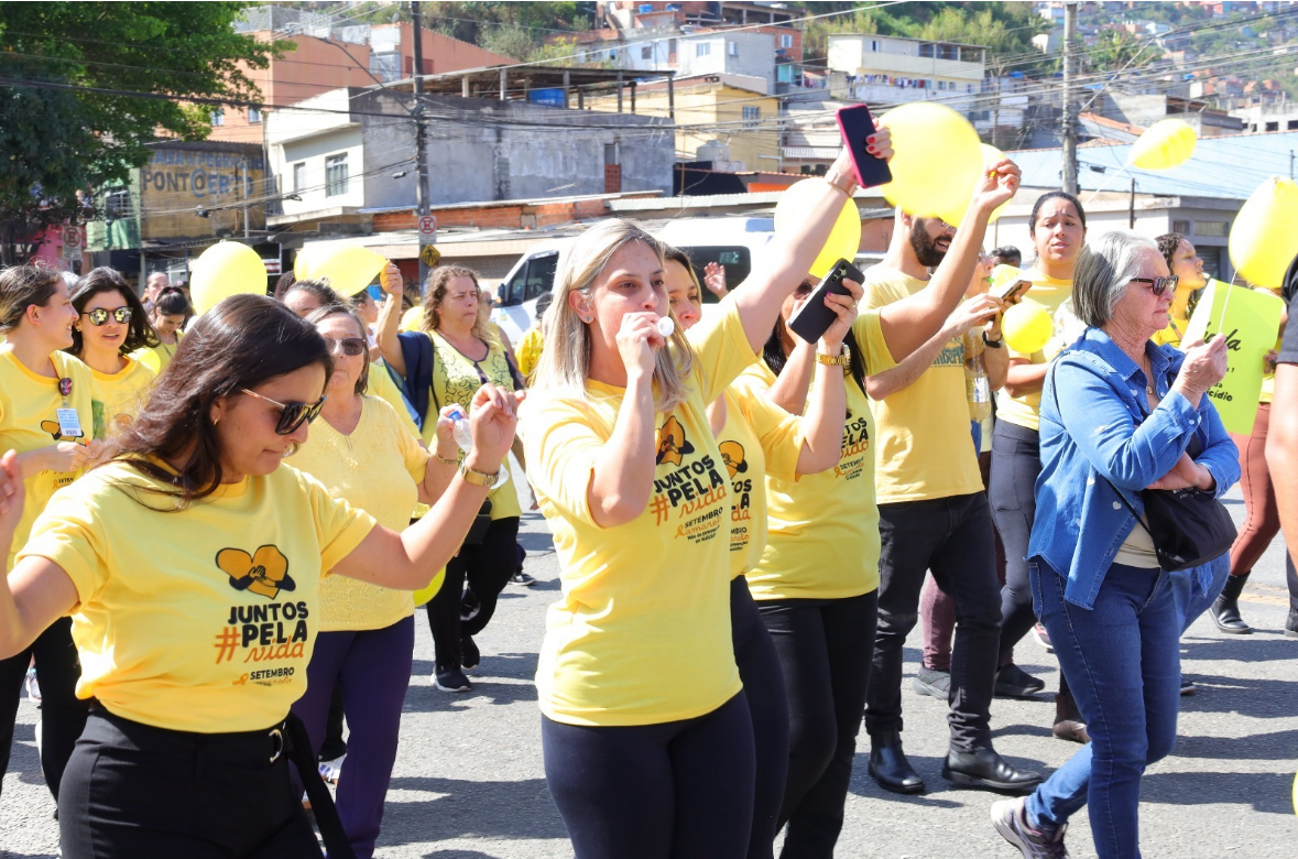 Vestidos de amarelo e branco, profissionais da saúde, usuários do SUS (Sistema Único de Saúde) e moradores da região caminharam juntos por boa parte do centro comercial da Avenida Castelo Branco, levando mensagens de acolhimento, empatia e cuidado com a saúde mental.