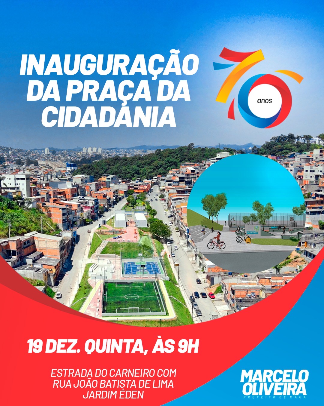 Nesta quinta-feira (19), às 9h, vamos inaugurar a tão aguardada Praça da Cidadania, entre o Jardim Éden e o Hélida. Esse espaço será um marco para nossa cidade, com um complexo esportivo de alta qualidade e oportunidades únicas de formação com cursos profissionalizantes para capacitar nossa população e gerar novas perspectivas. Você é nosso convidado especial para conhecer de perto esse grande projeto que transformará vidas. Vamos juntos construir um futuro melhor!”, disse.
