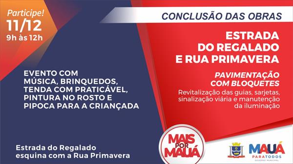 A Prefeitura de Mauá concluiu esta semana as obras de pavimentação da Estrada do Regalado e da Rua Primavera, onde foram investidos mais de R$ 850 mil para a instalação de bloquetes. Por se tratar de região localizada em área de manancial, o local não pode receber asfalto. Para marcar a entrega dessa importante intervenção, a Prefeitura de Mauá vai promover uma atividade no próximo domingo, 11 de dezembro, a partir das 9h.