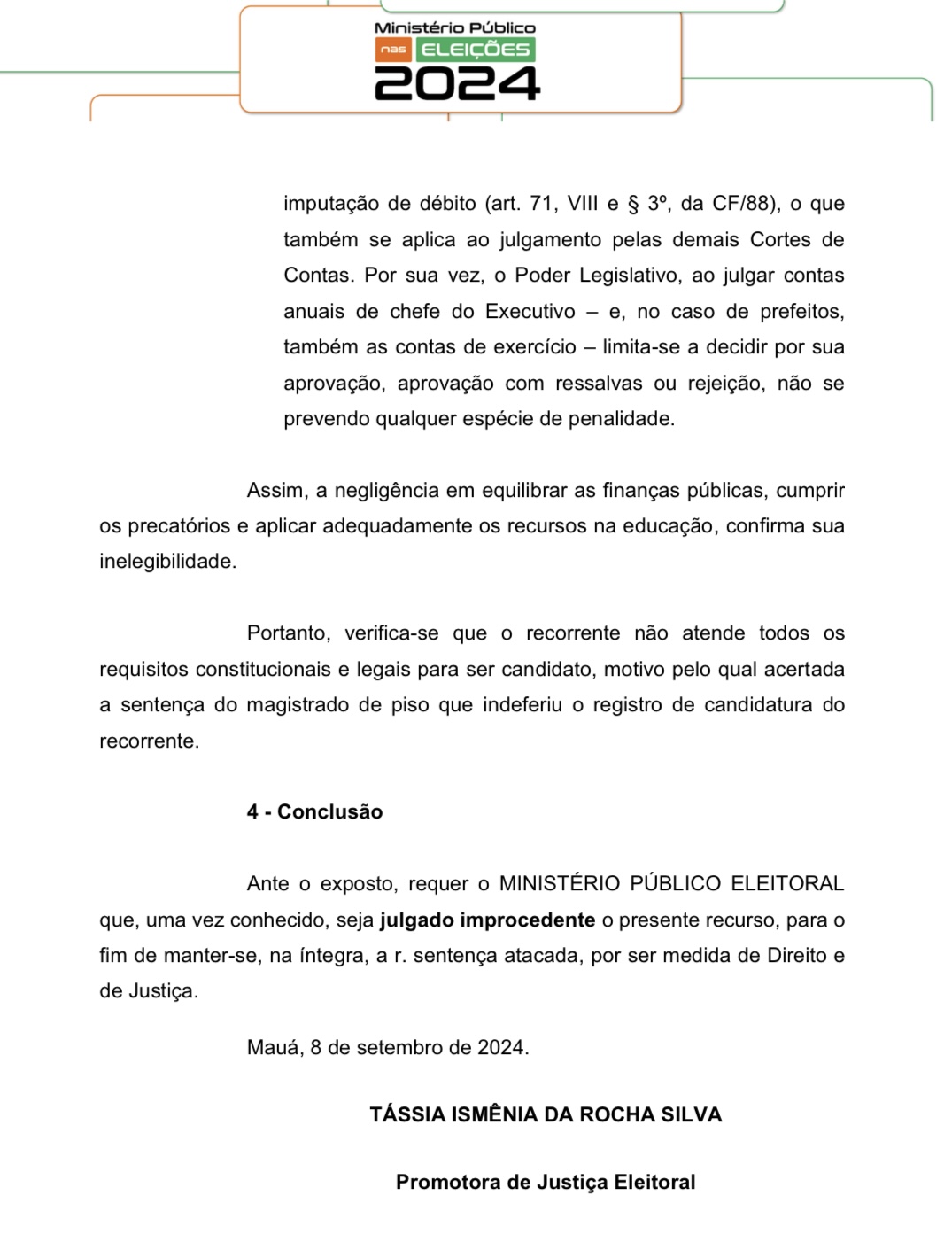 “Ante o exposto, requer o MINISTÉRIO PÚBLICO ELEITORAL que, uma vez conhecido, seja julgado improcedente o presente recurso, para o fim de manter-se, na íntegra, a r. sentença atacada, por ser medida de Direito e de Justiça”, conclui Tássia.