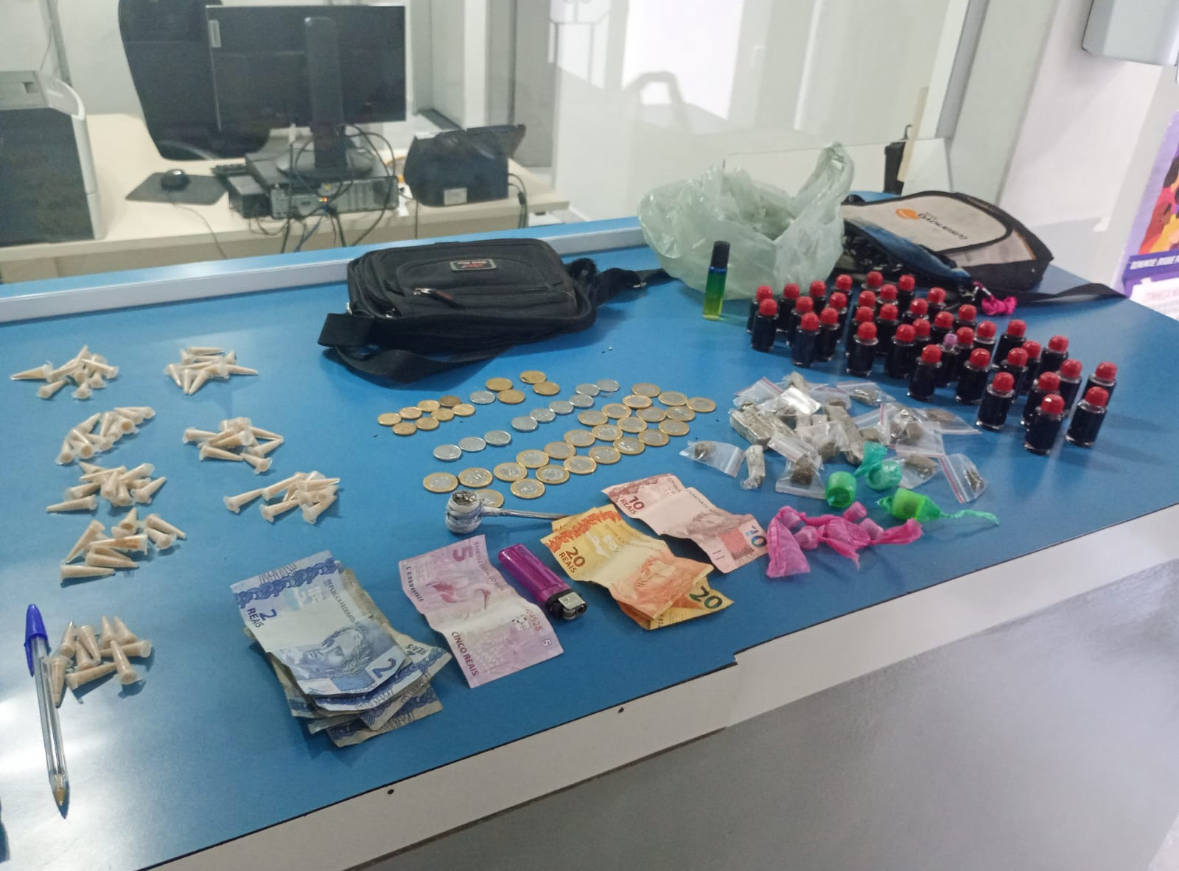 Na revista pessoal, foram localizadas quantidades significativas de drogas. 79 pacotes de crack, 33 de maconha e 35 frascos de lança perfume.